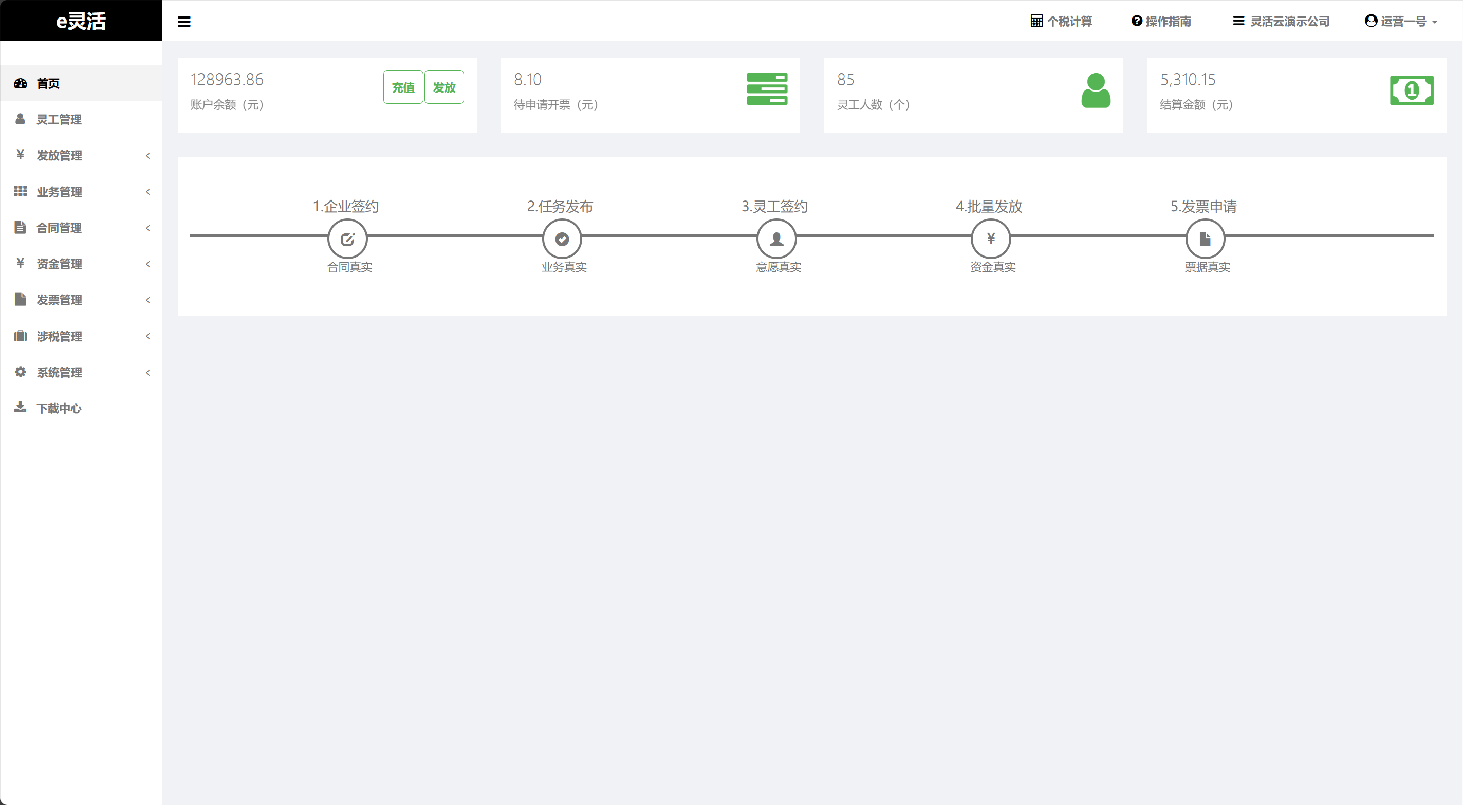 用工企业使用企业端:灵活云企业服务平台,一站式完成电子签约、灵工管理、任务发布、智能派单、费用结算、批量支付、发票申请等全流程操作。平台具备实名信息采集、实名验证、电子签约、交易管理、资金管理、合同管理、发票管理、涉税申报等功能,实现灵活用工业务全场景、交易环节全流程的记录展示,确保业务真实、四流合一。