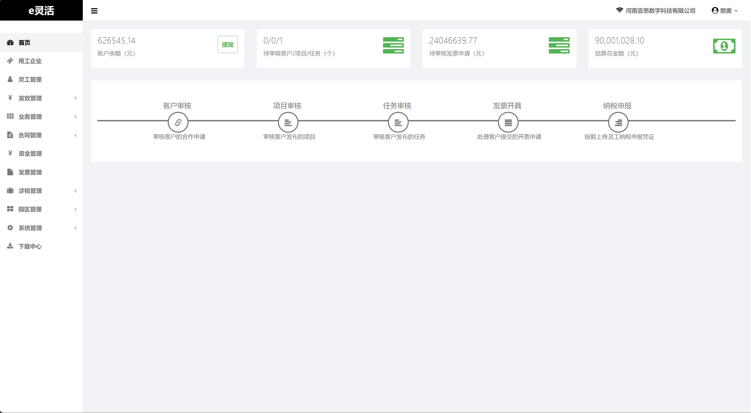 服务商使用服务商端:灵活云服务商平台,完成风控审核、项目承接、电子签约、发票开具等操作。平台具备企业管理、灵工管理、项目管理、任务管理、交易管理、合同管理、资金管理、发票管理等功能,实现灵活用工业务全场景、交易环节全流程的记录展示,确保业务真实、四流合一。