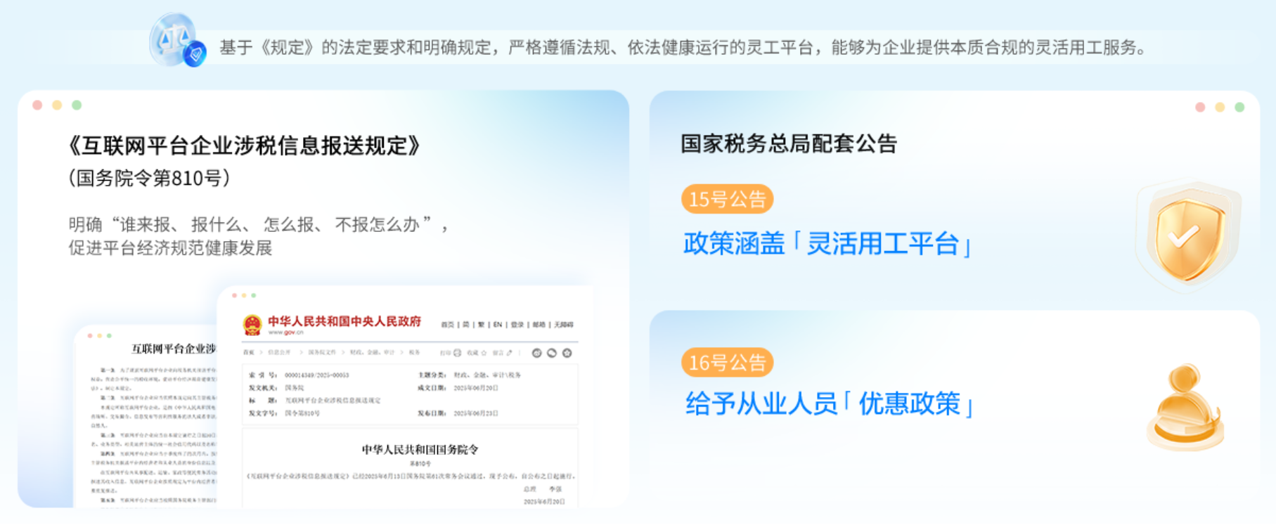 国务院、国家税务总局发布互联网平台企业涉税规定及相关公告,明确互联网平台企业(包括灵活用工平台)应当依规对平台内的经营者和从业人员的涉税信息进行报送,同时对从业人员从互联网平台上获取的收入性质进行了明确: