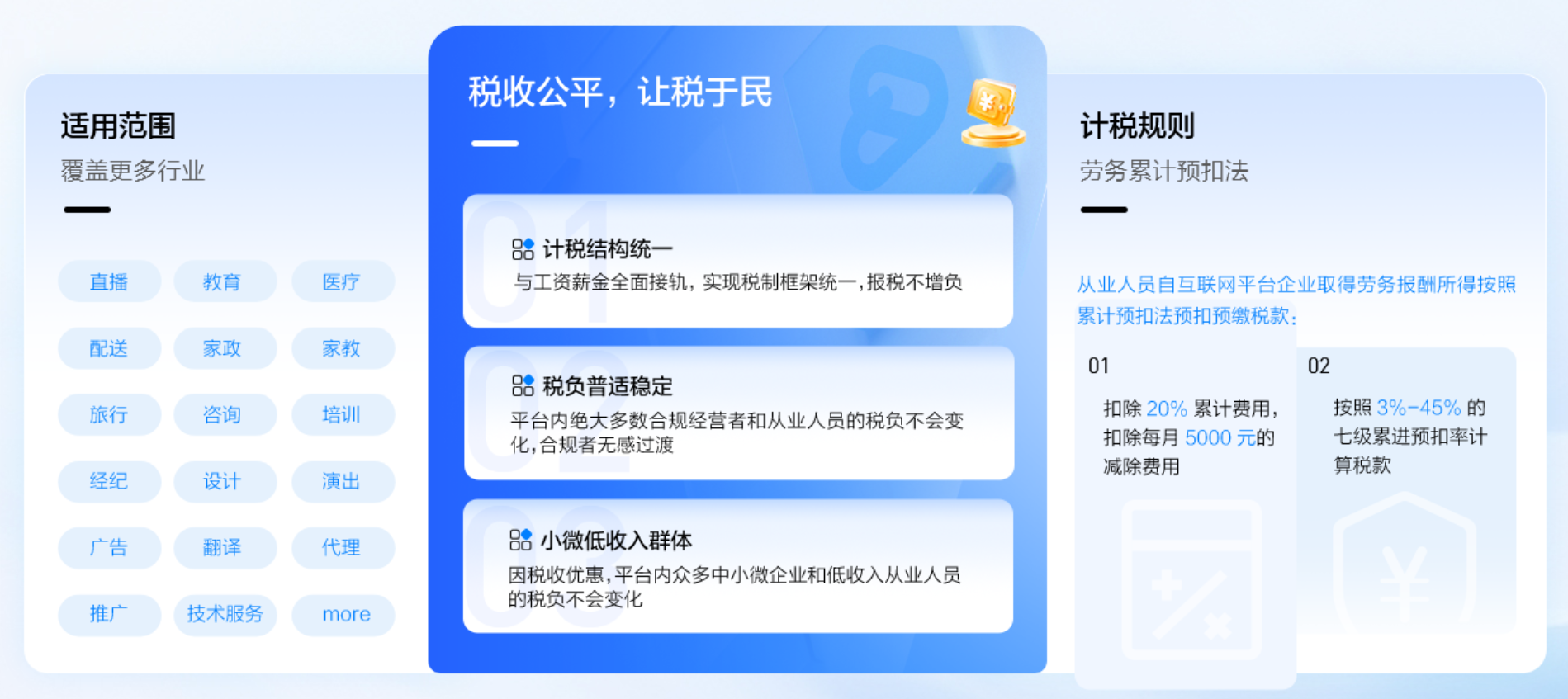 依据“国家税务总局关于互联网平台企业为平台内从业人员办理扣缴申报、代办申报若干事项的公告”,针对从业人员自互联网平台企业取得服务收入,适用连续劳务模式,预扣预缴个人所得税(享受20%费用扣除+5000元/月减除),代办申报增值税及附加税(享受增值税月收入10万以内免征)。
